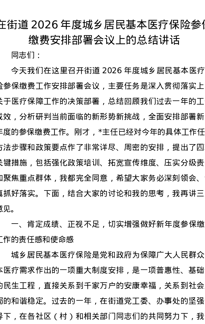在街道2026年度城乡居民基本医疗保险参保缴费安排部署会议上的总结讲话