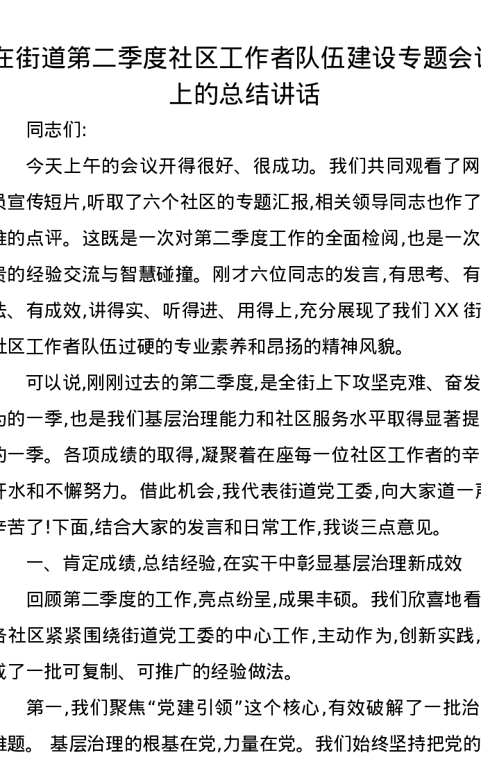 在街道第二季度社区工作者队伍建设专题会议上的总结讲话