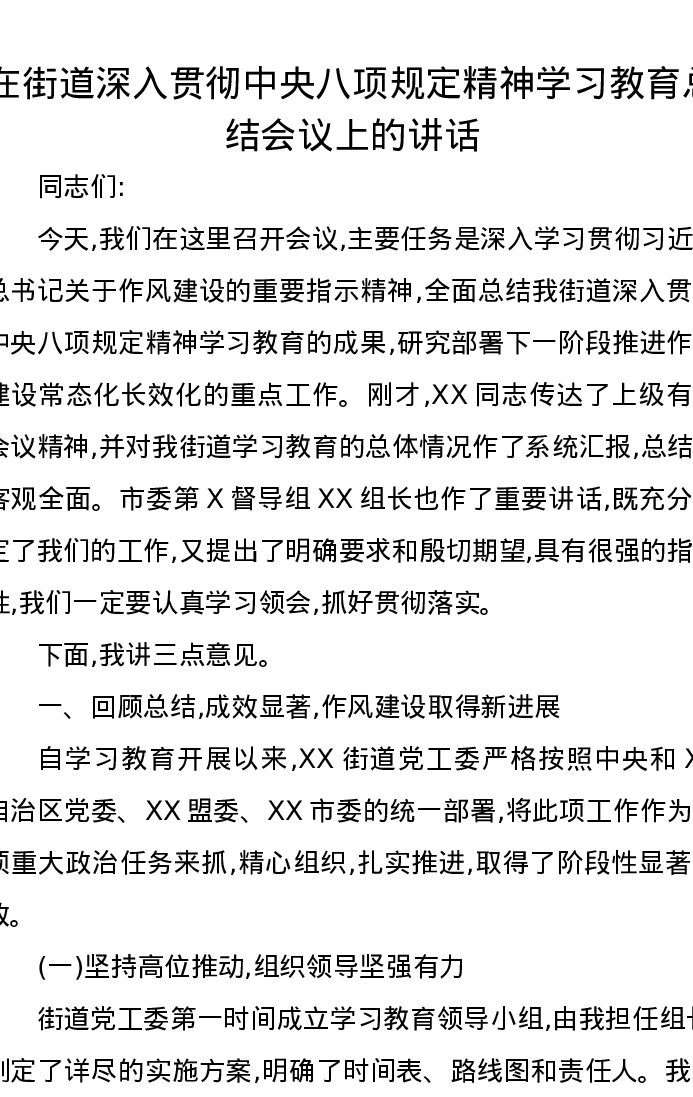 在街道深入贯彻中央八项规定精神学习教育总结会议上的讲话