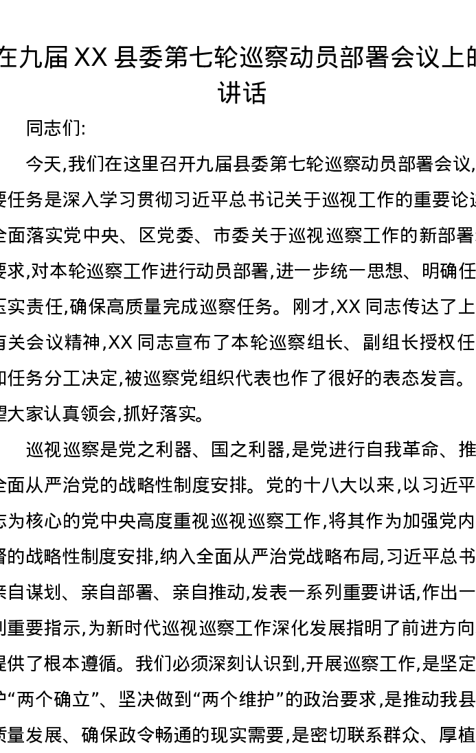 在九届XX县委第七轮巡察动员部署会议上的讲话