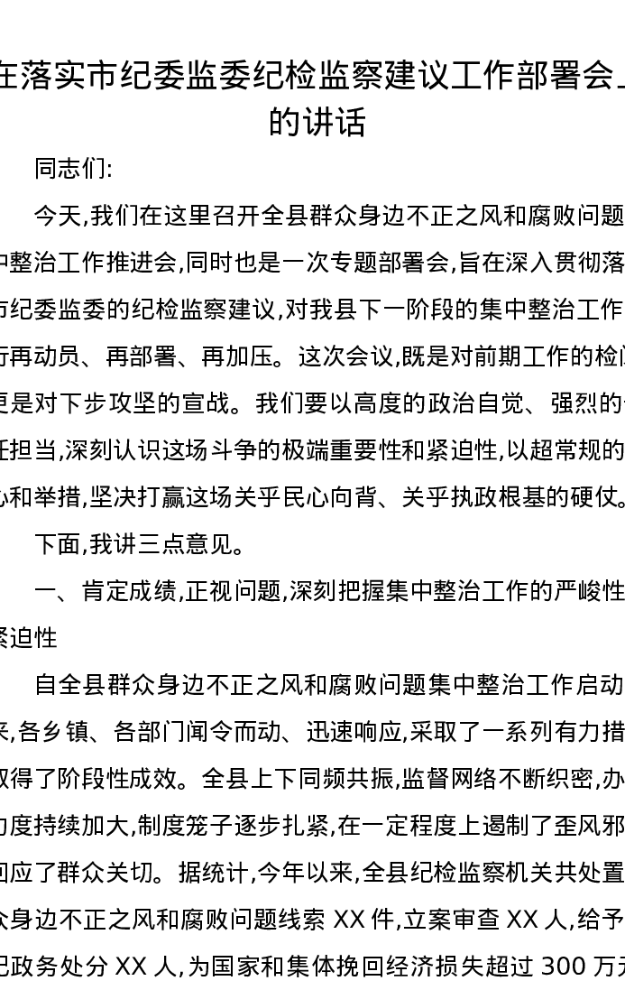 在落实市纪委监委纪检监察建议工作部署会上的讲话