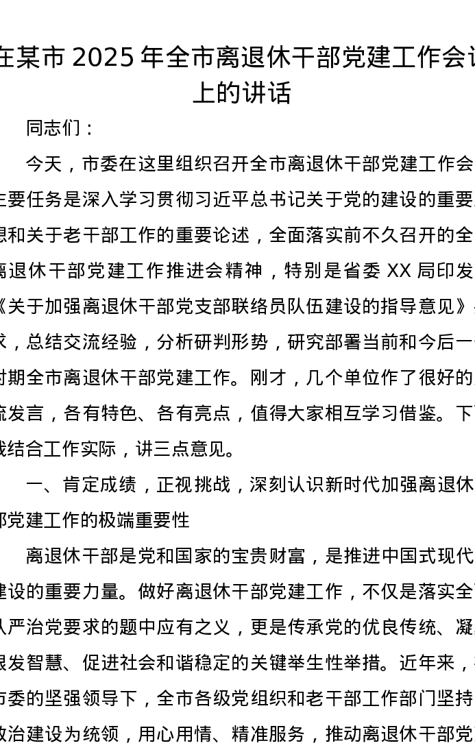 在某市2025年全市离退休干部党建工作会议上的讲话