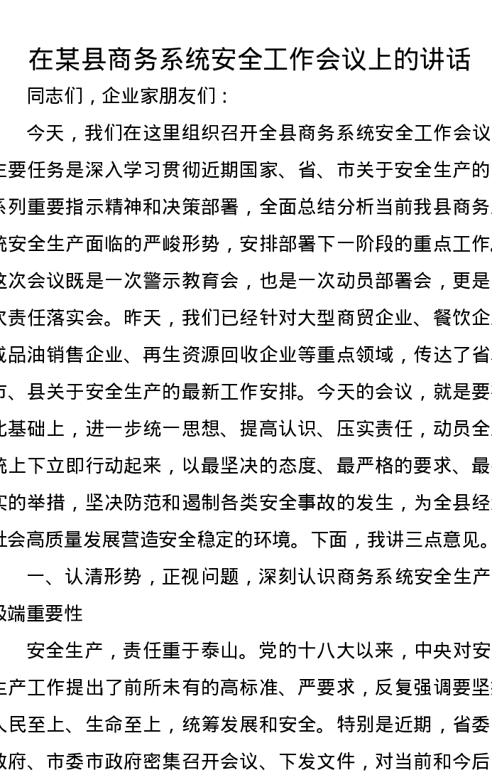 在某县商务系统安全工作会议上的讲话