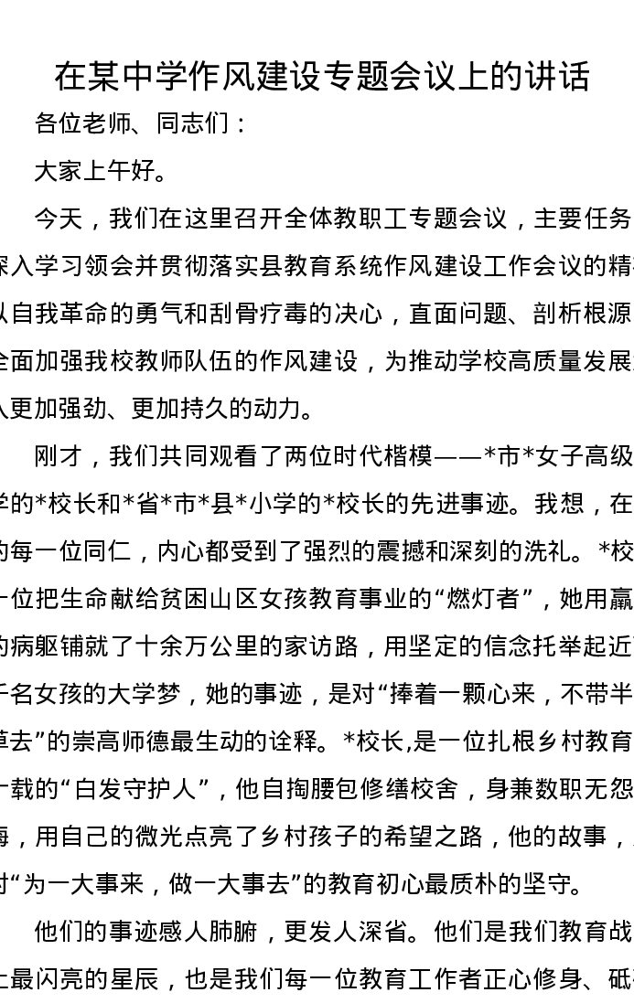 在某中学作风建设专题会议上的讲话