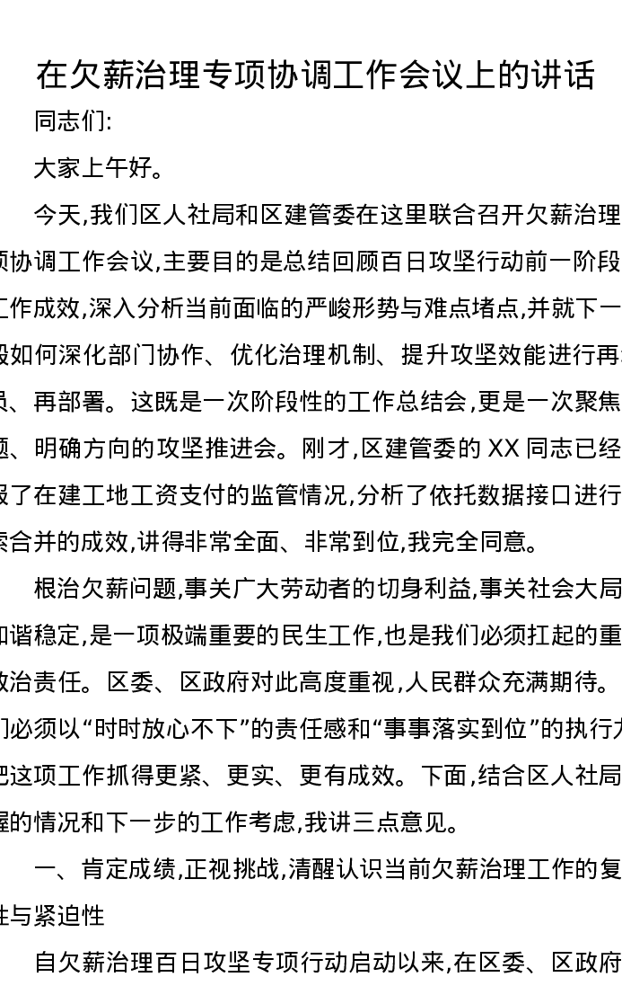 在欠薪治理专项协调工作会议上的讲话