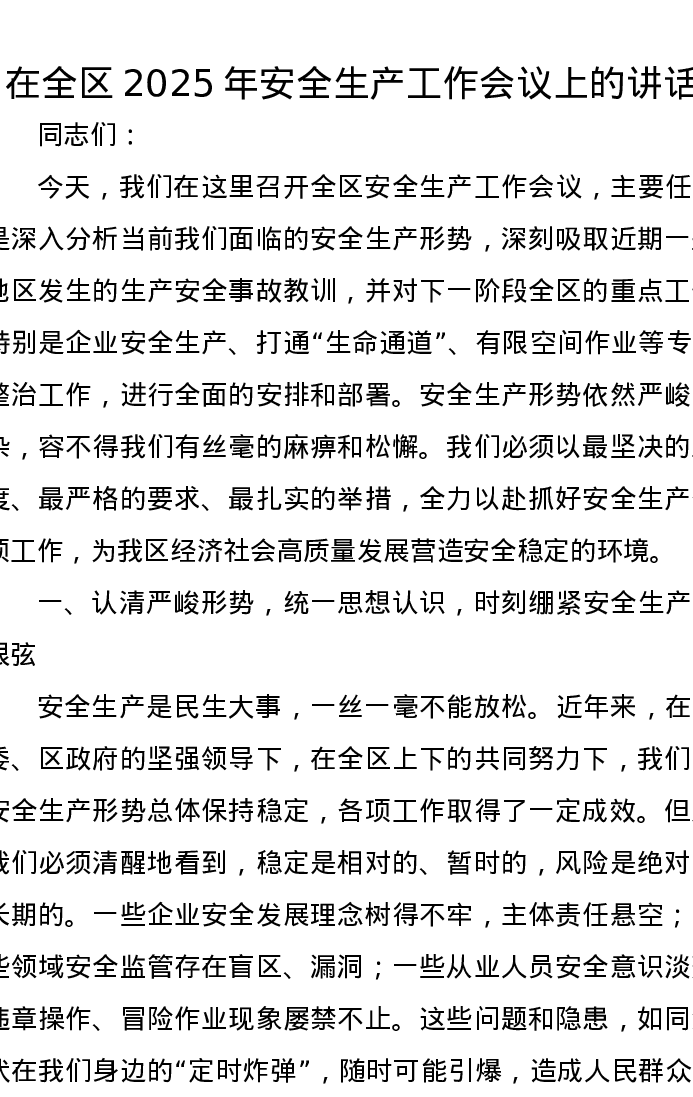 在全区2025年安全生产工作会议上的讲话