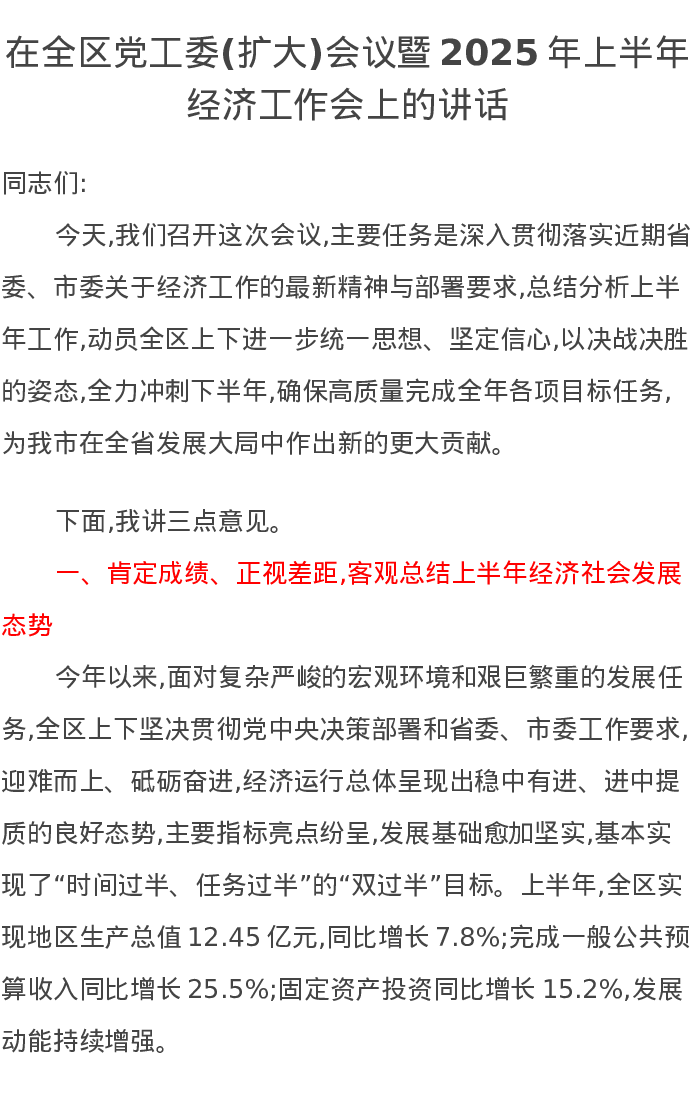 在全区党工委(扩大)会议暨2025年上半年经济工作会上的讲话