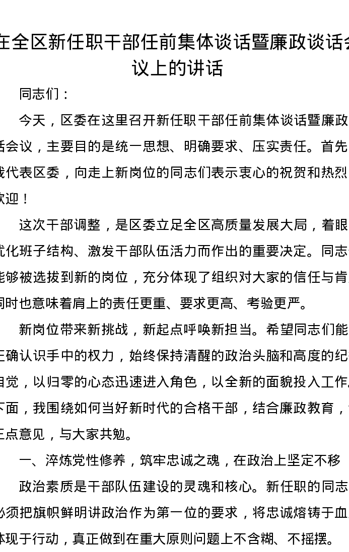 在全区新任职干部任前集体谈话暨廉政谈话会议上的讲话