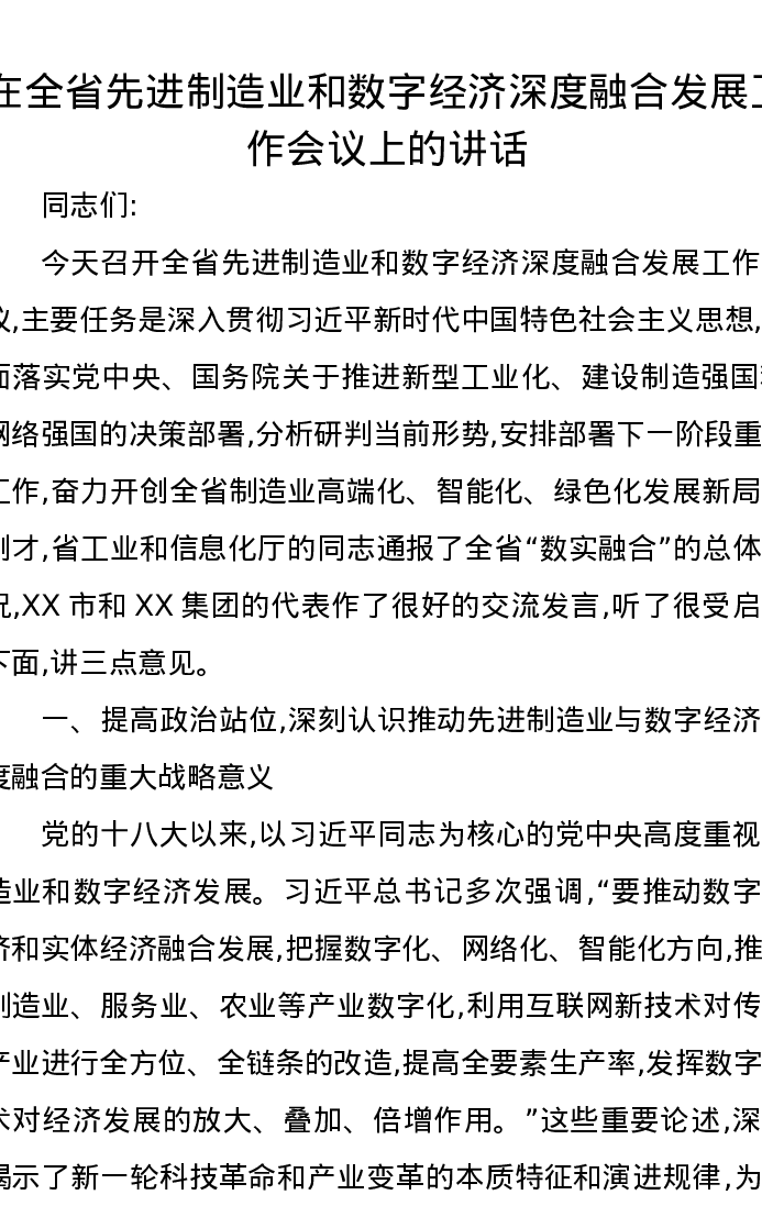 在全省先进制造业和数字经济深度融合发展工作会议上的讲话