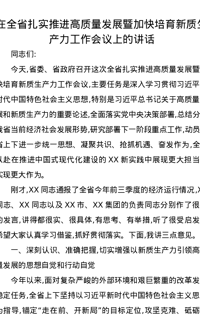 在全省扎实推进高质量发展暨加快培育新质生产力工作会议上的讲话