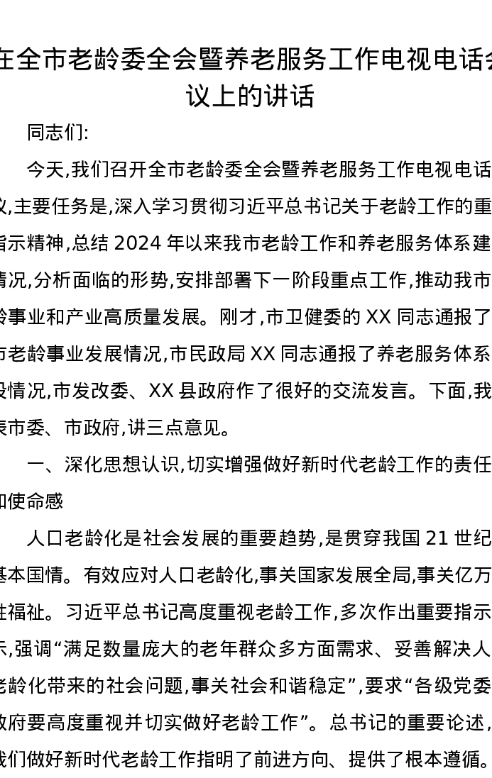 在全市老龄委全会暨养老服务工作电视电话会议上的讲话