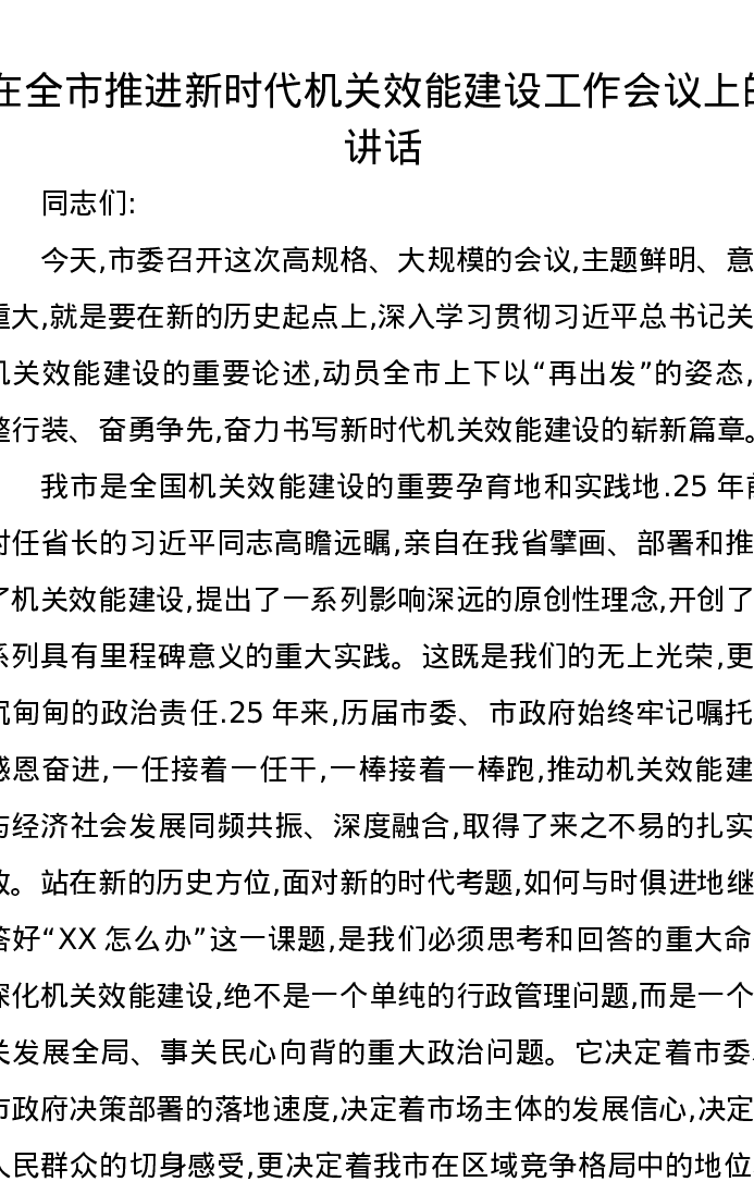 在全市推进新时代机关效能建设工作会议上的讲话