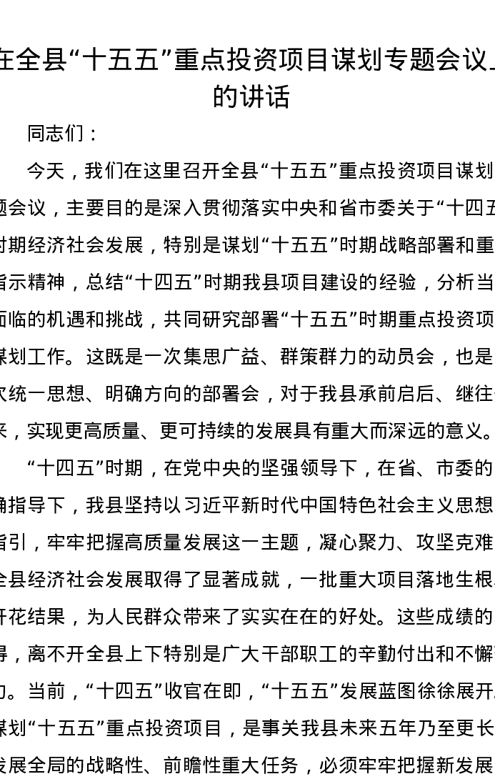 在全县“十五五”重点投资项目谋划专题会议上的讲话