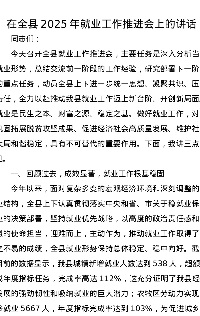 在全县2025年就业工作推进会上的讲话