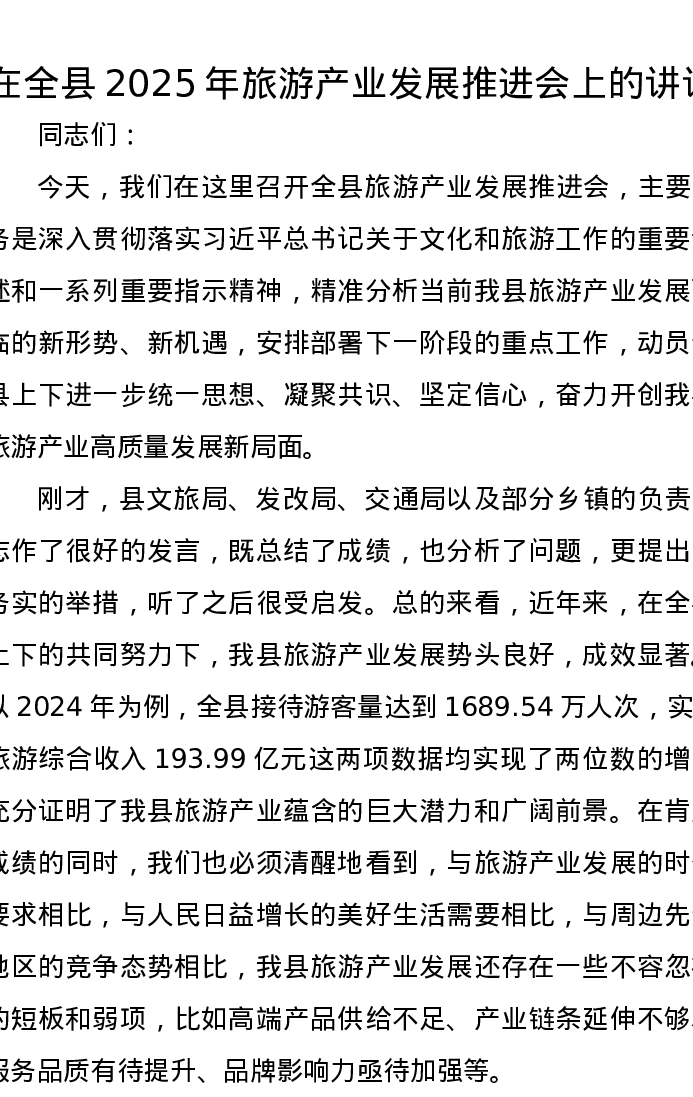 在全县2025年旅游产业发展推进会上的讲话