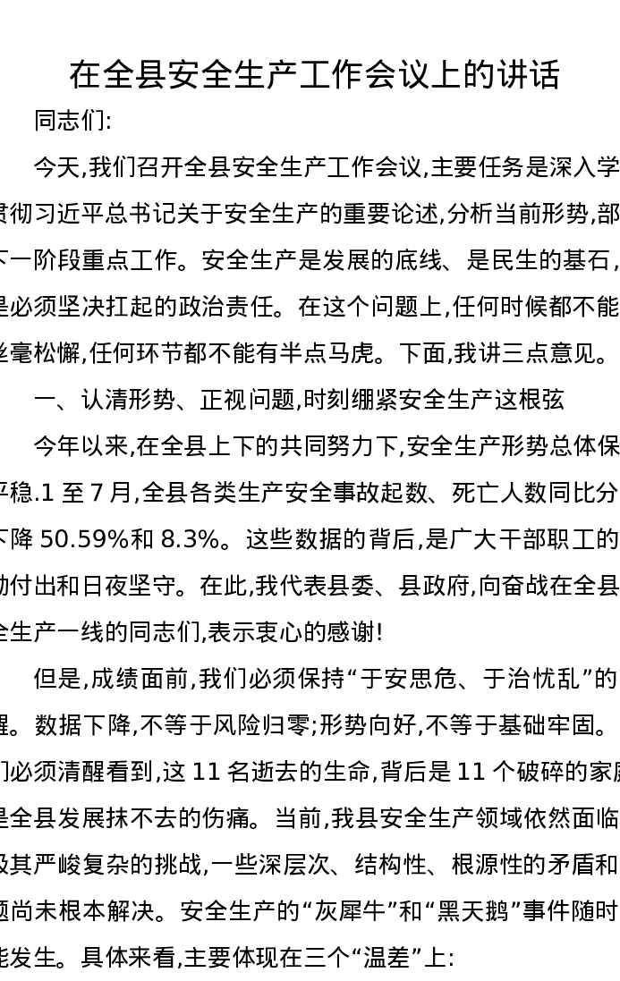 在全县安全生产工作会议上的讲话3
