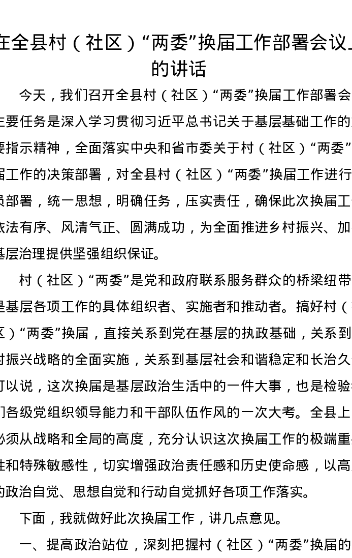 在全县村(社区)“两委”换届工作部署会议上的讲话