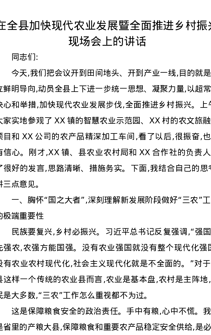 在全县加快现代农业发展暨全面推进乡村振兴现场会上的讲话