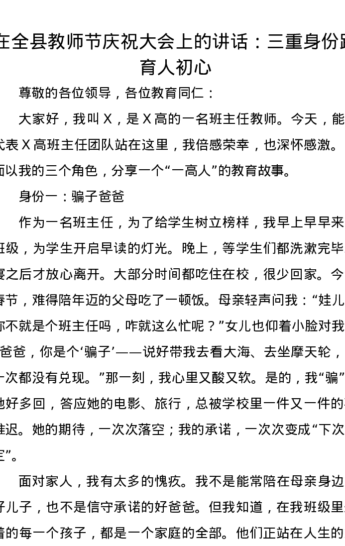 在全县教师节庆祝大会上的讲话:三重身份践育人初心
