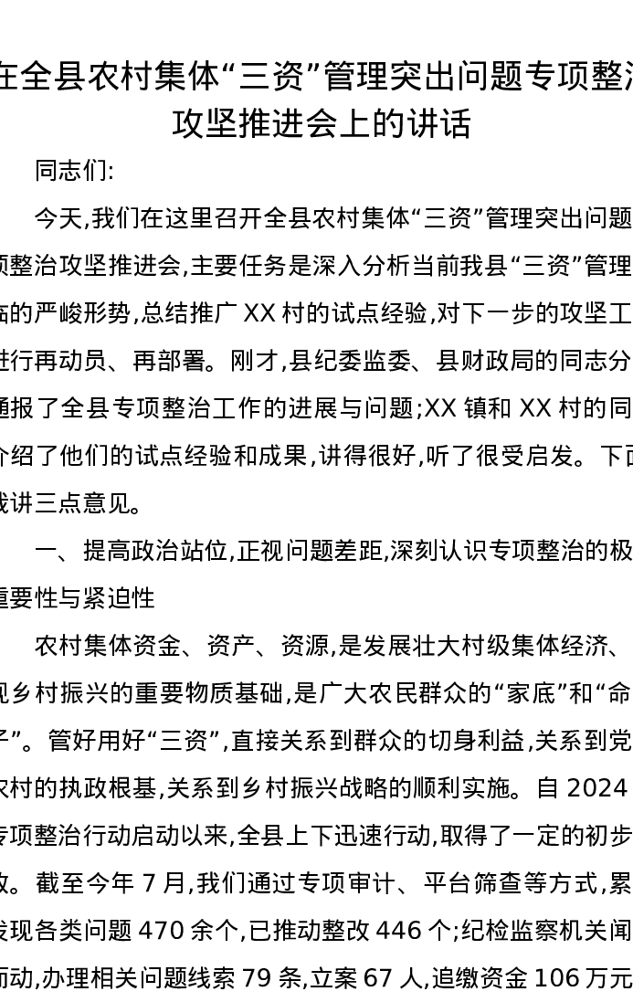 在全县农村集体“三资”管理突出问题专项整治攻坚推进会上的讲话