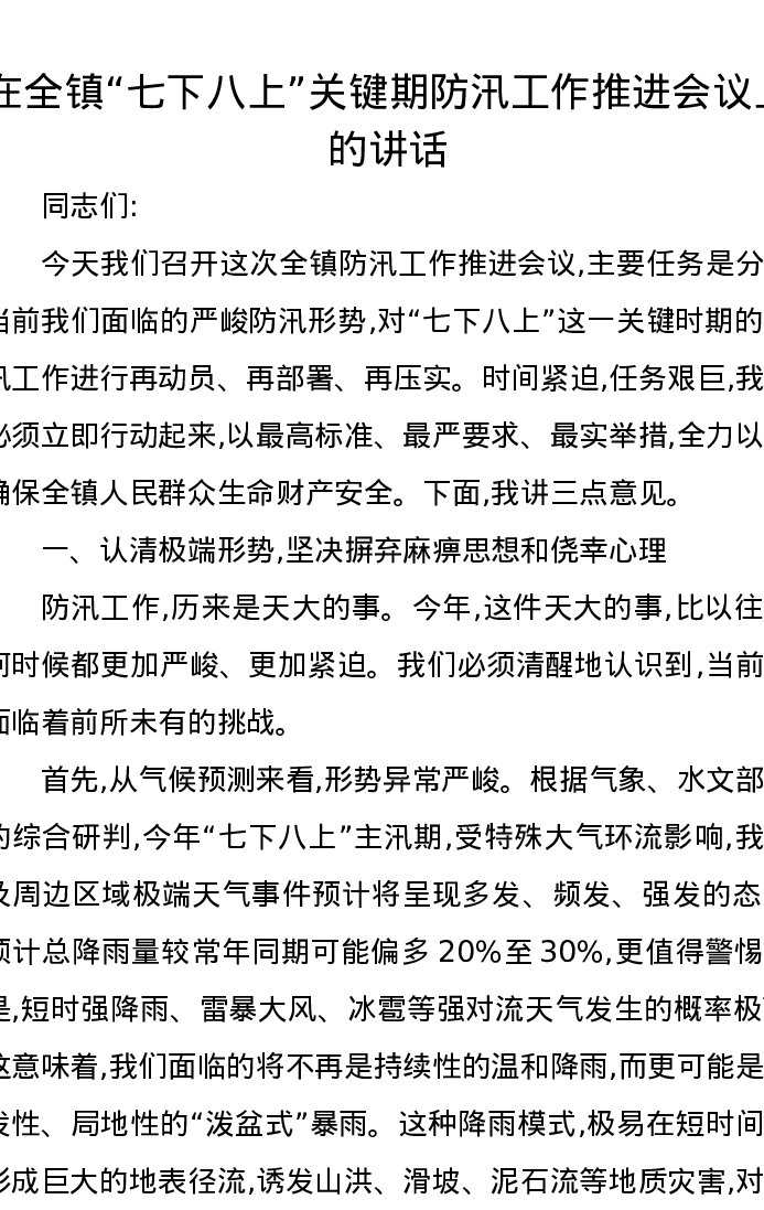 在全镇“七下八上”关键期防汛工作推进会议上的讲话