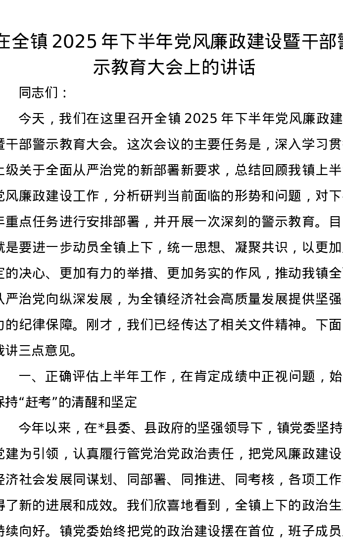 在全镇2025年下半年党风廉政建设暨干部警示教育大会上的讲话
