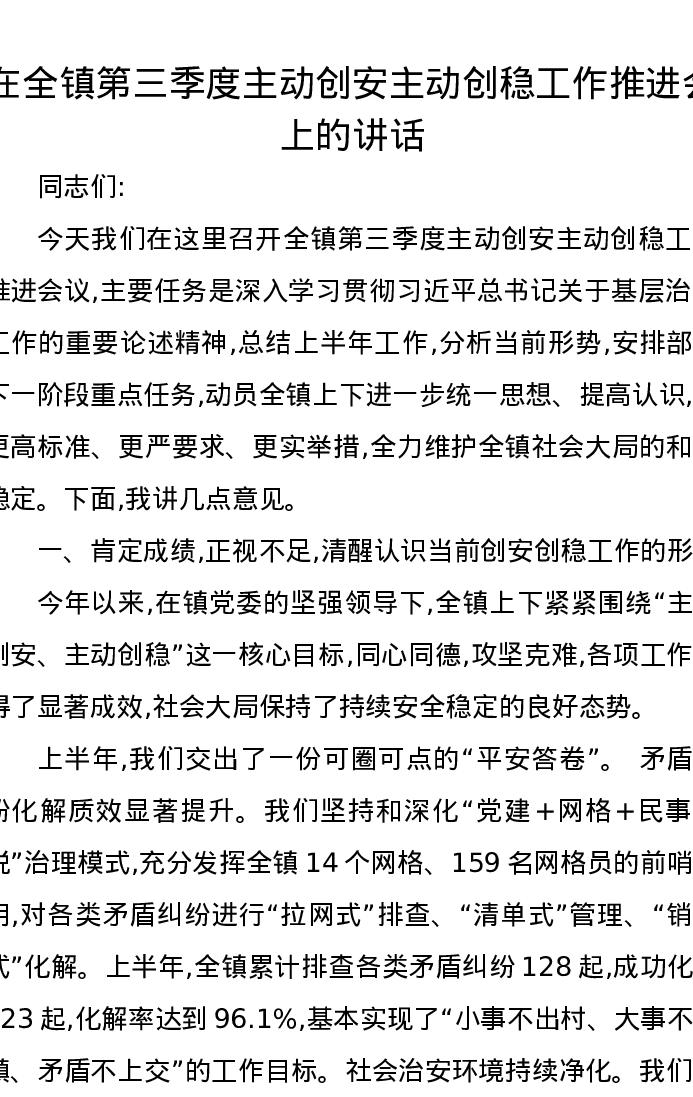 在全镇第三季度主动创安主动创稳工作推进会上的讲话