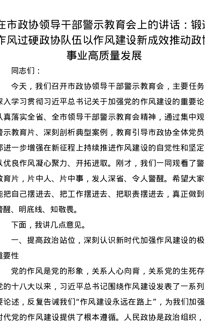 在市政协领导干部警示教育会上的讲话:锻造作风过硬政协队伍以作风建设新成效推动政协事业高质量发展