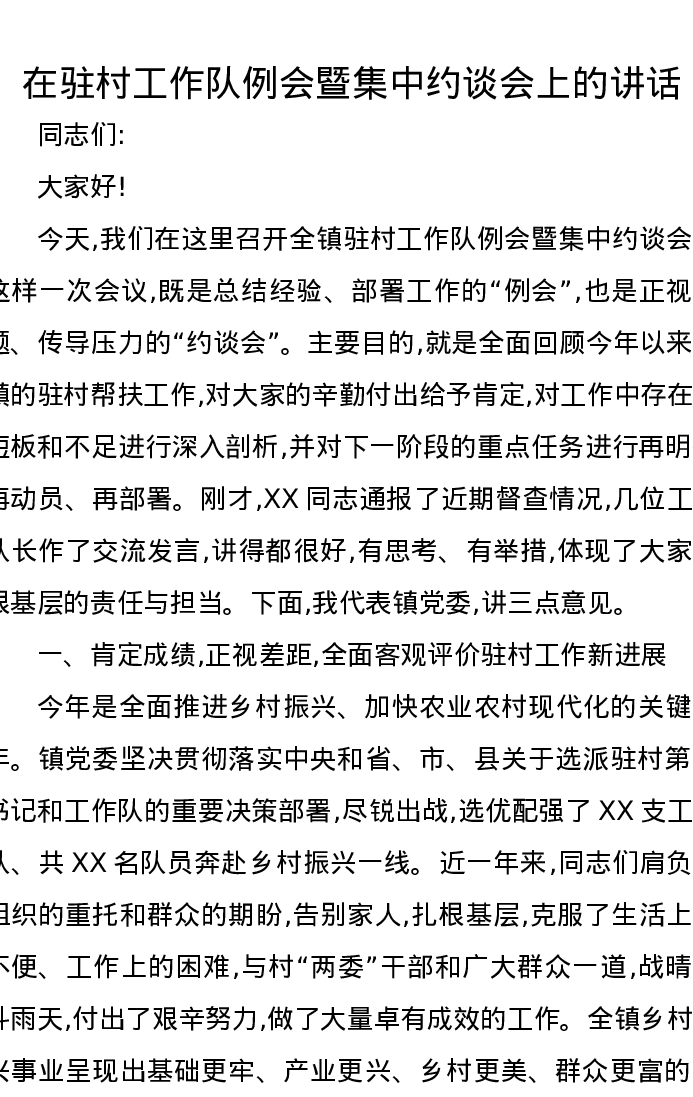 在驻村工作队例会暨集中约谈会上的讲话