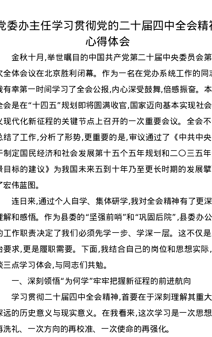 党委办主任学习贯彻党的二十届四中全会精神心得体会