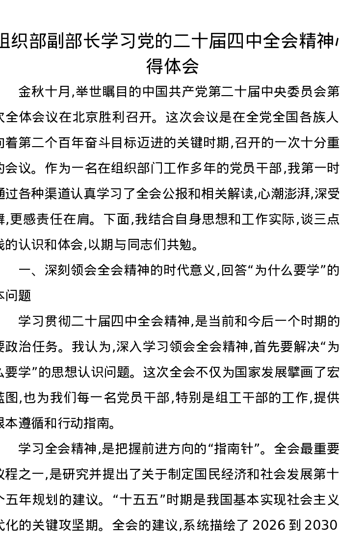 组织部副部长学习党的二十届四中全会精神心得体会