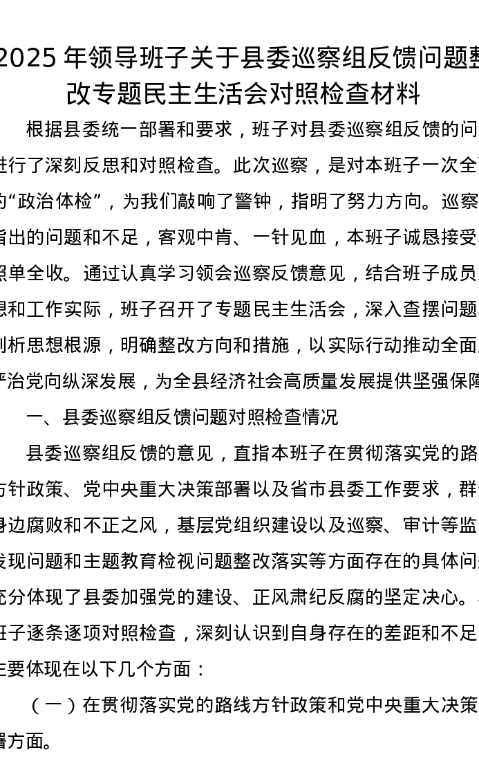 2025年领导班子关于县委巡察组反馈问题整改专题民主生活会对照检查材料
