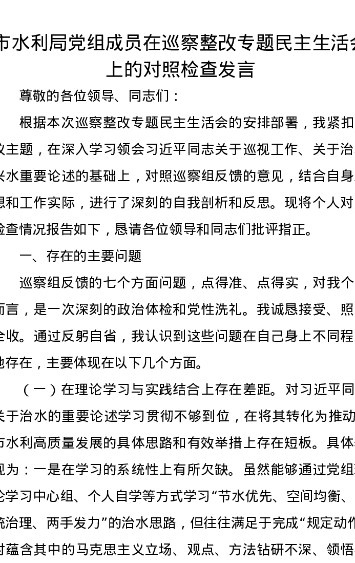 市水利局党组成员在巡察整改专题民主生活会上的对照检查发言