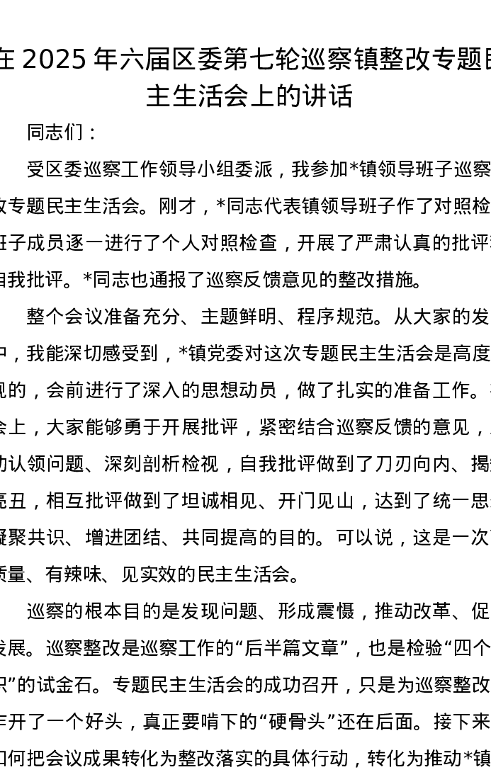 在2025年六届区委第七轮巡察镇整改专题民主生活会上的讲话