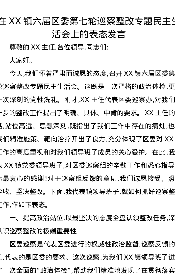 在XX镇六届区委第七轮巡察整改专题民主生活会上的表态发言