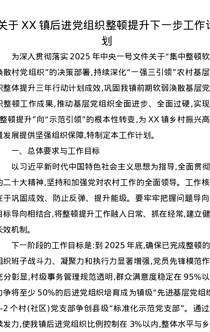 关于XX镇后进党组织整顿提升下一步工作计划