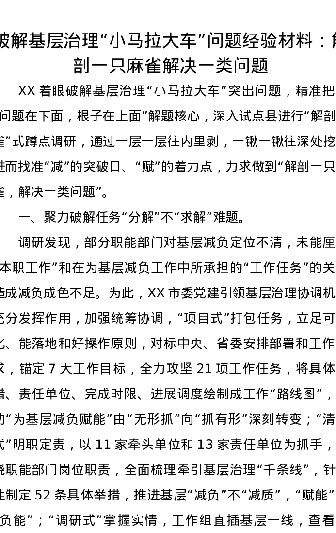 破解基层治理“小马拉大车”问题经验材料:解剖一只麻雀解决一类问题