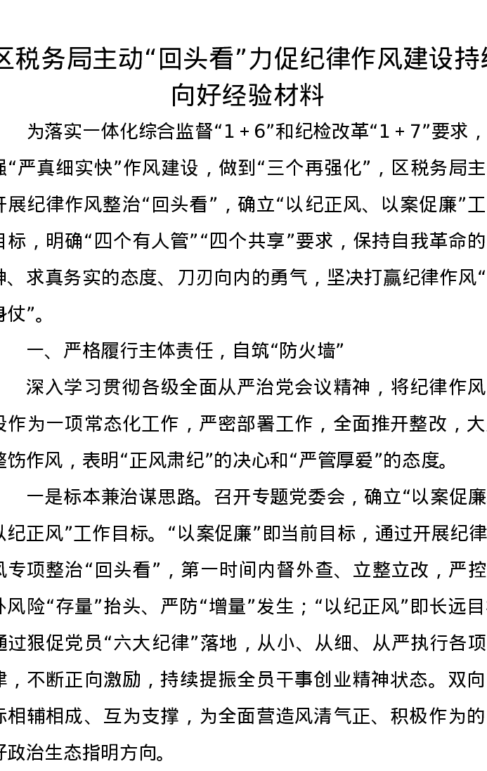 区税务局主动“回头看”力促纪律作风建设持续向好经验材料