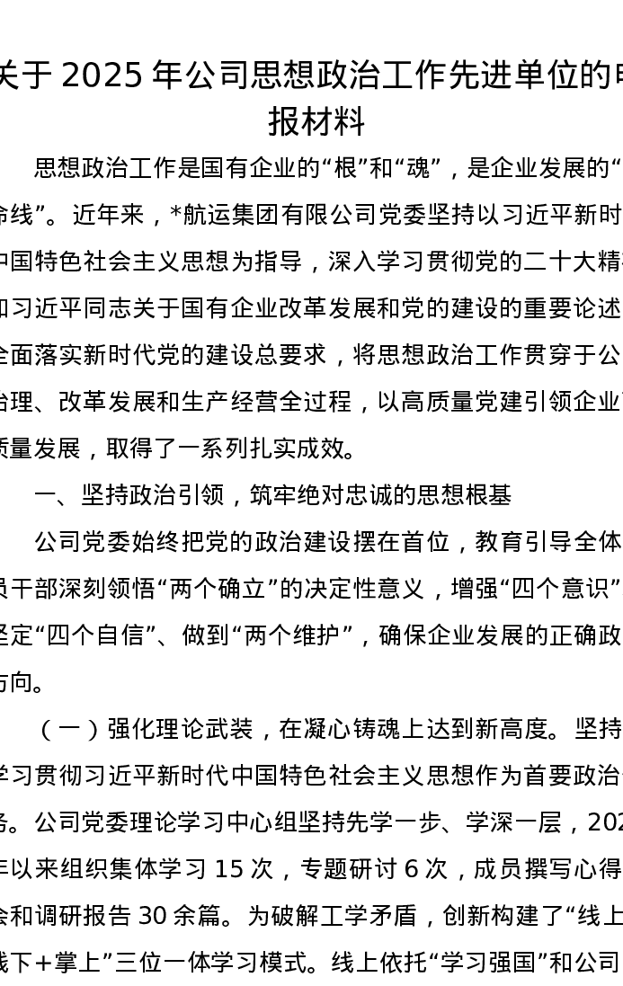 关于2025年公司思想政治工作先进单位的申报事迹材料