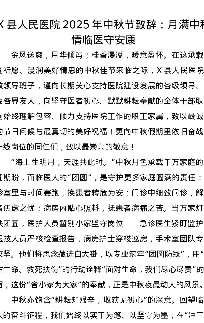 X县人民医院2025年中秋节致辞:月满中秋情临医守安康