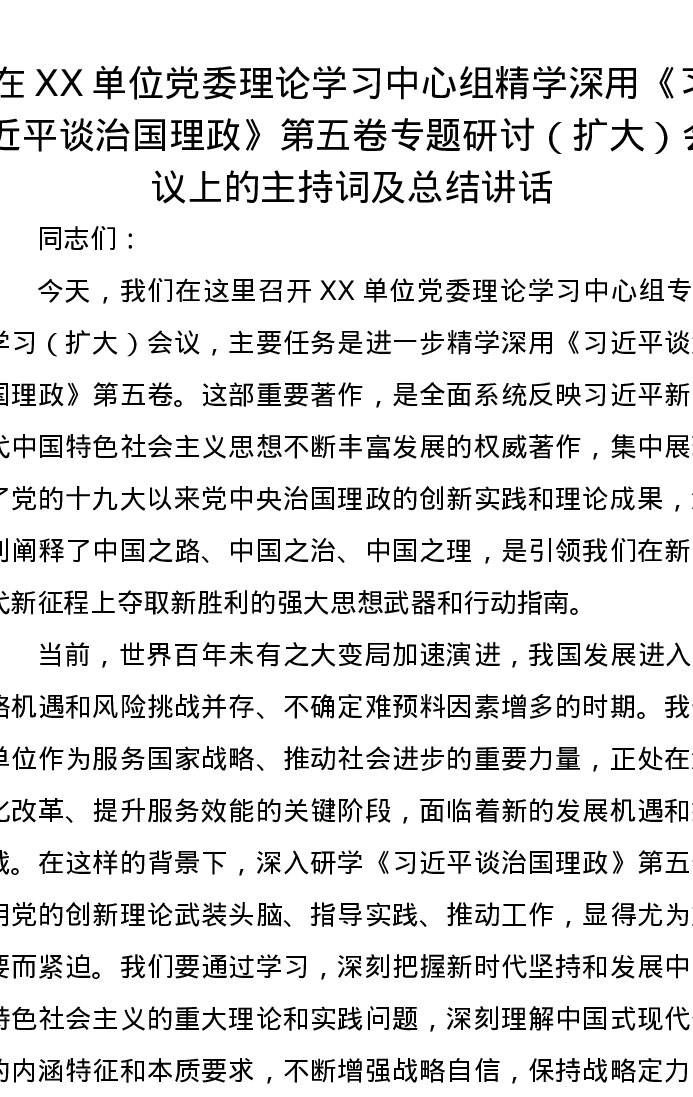 在XX单位党委理论学习中心组精学深用《习近平谈治国理政》第五卷专题研讨(扩大)会议上的主持词及总结讲话