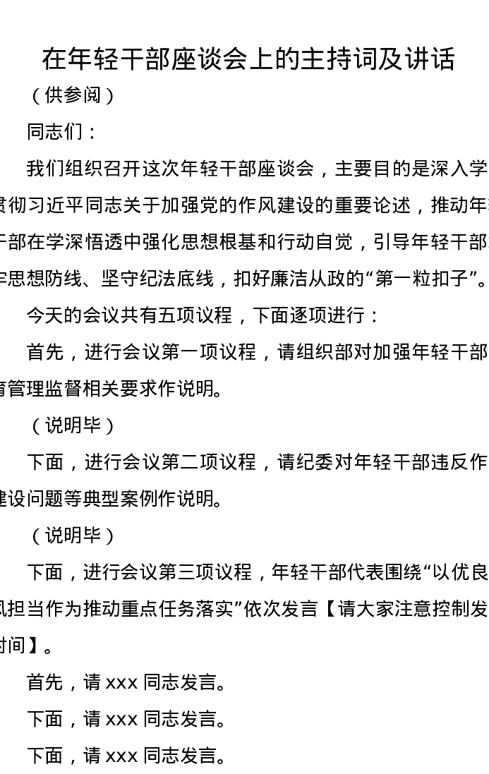 在年轻干部座谈会上的主持词及讲话