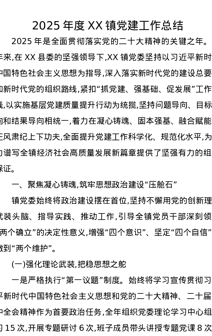2025年度XX镇党建工作总结