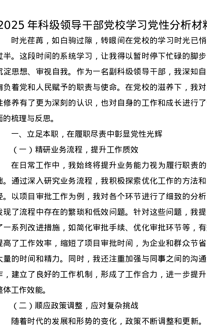 2025年科级领导干部党校学习党性分析报告材料