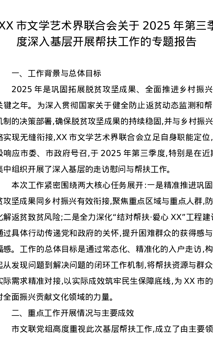 XX市文学艺术界联合会关于2025年第三季度深入基层开展帮扶工作的专题报告