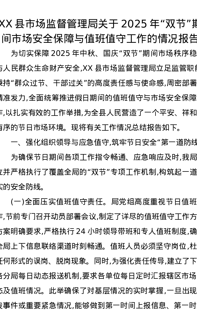 XX县市场监督管理局关于2025年“双节”期间市场安全保障与值班值守工作的情况报告