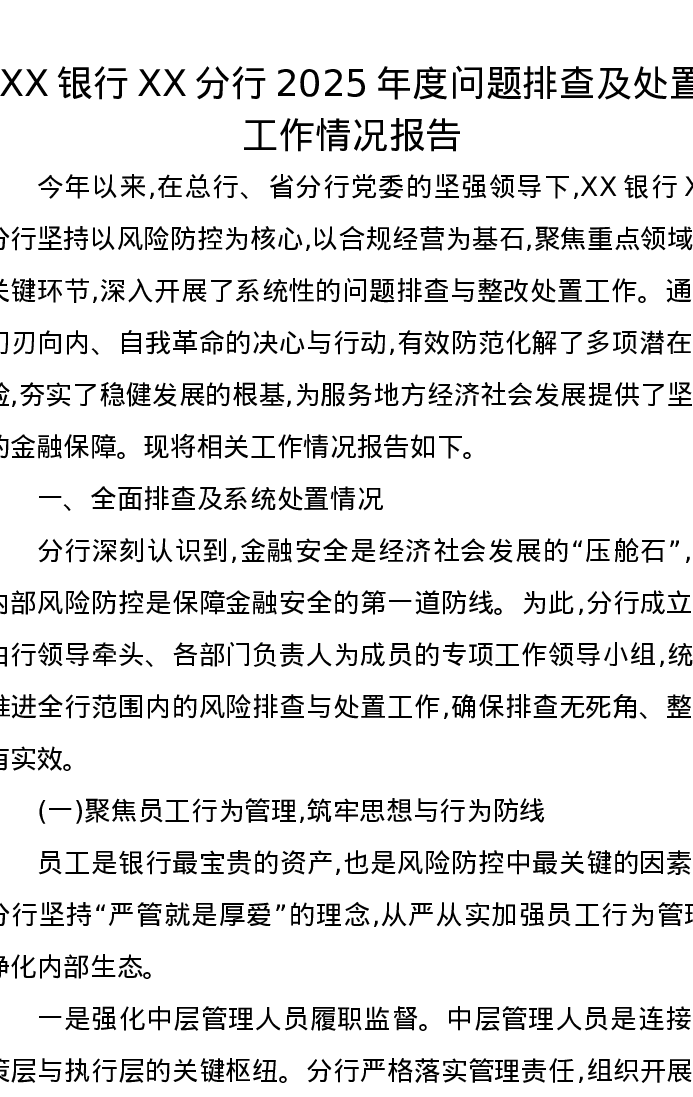 XX银行XX分行2025年度问题排查及处置工作情况报告