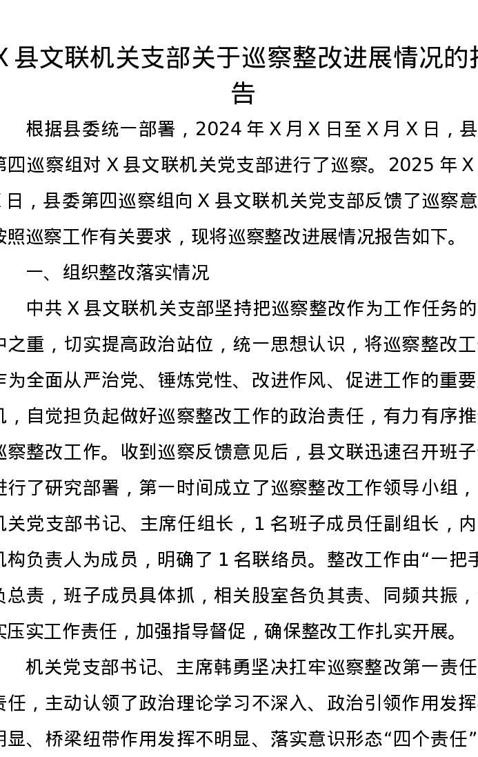 X县文联机关支部关于巡察整改进展情况的报告