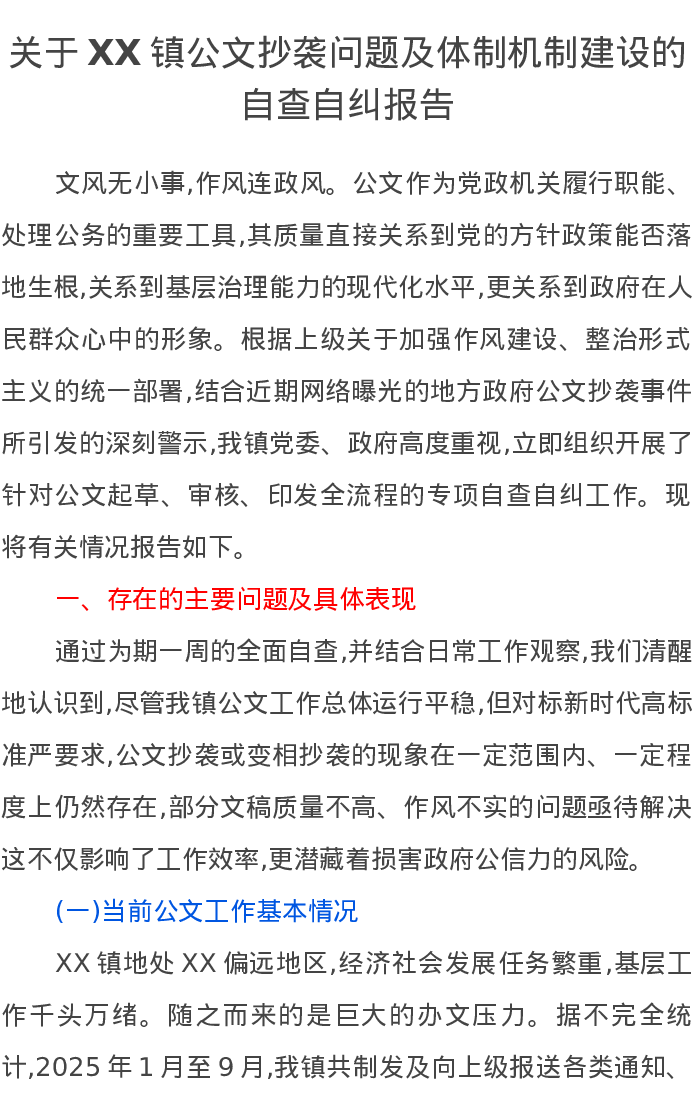 关于XX镇公文抄袭问题及体制机制建设的自查自纠报告