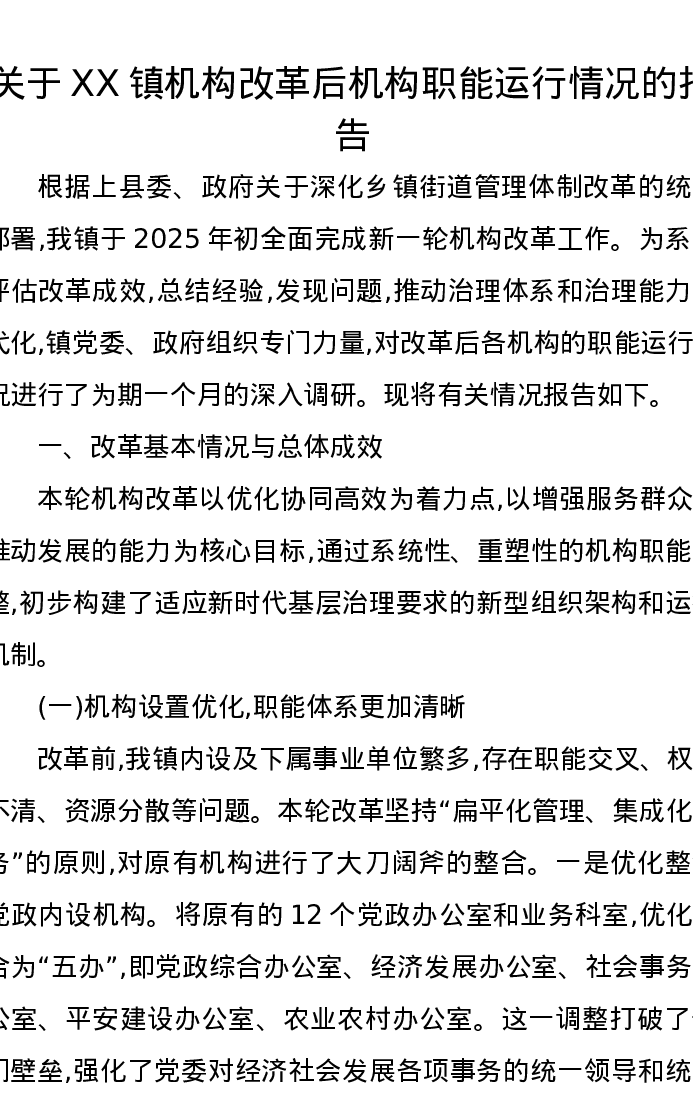 关于XX镇机构改革后机构职能运行情况的报告